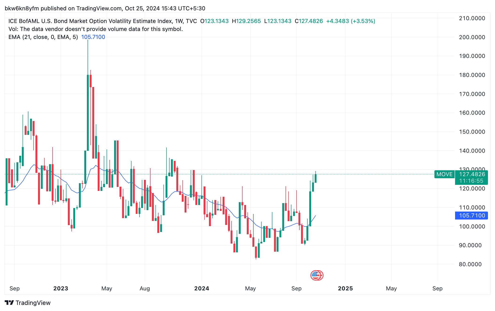 Bond market volatility (MOVE Index) is at 52-week highs, having surged enormously in the last few weeks.
