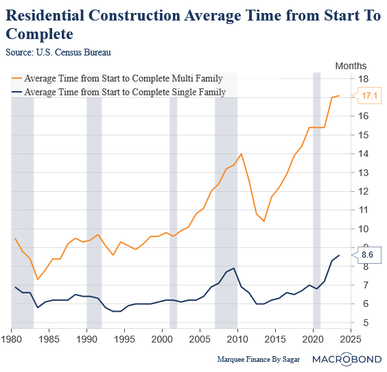 As we can observe, the time taken to complete a multi-family housing rose significantly from 14 months pre-COVID to 17 months. So, one can assume that today's completions began in Q422/Q123.