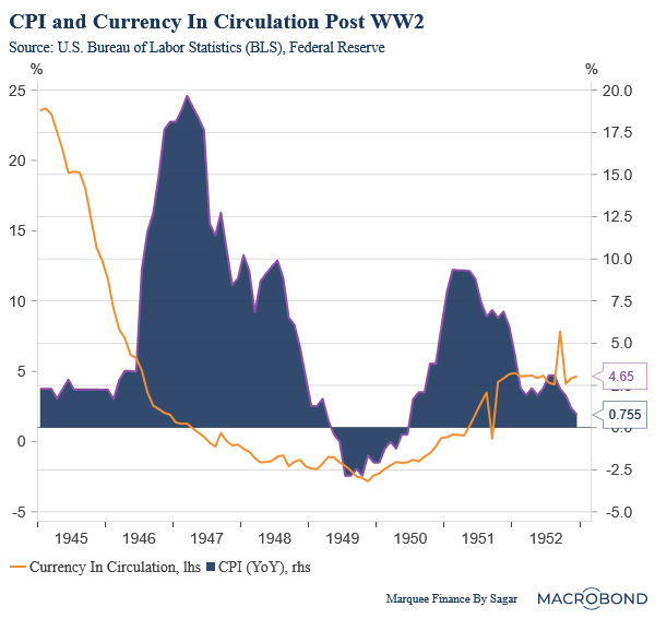 Inflation in 1946-47 peaked at 20%, and plunged as the Money Supply came down.