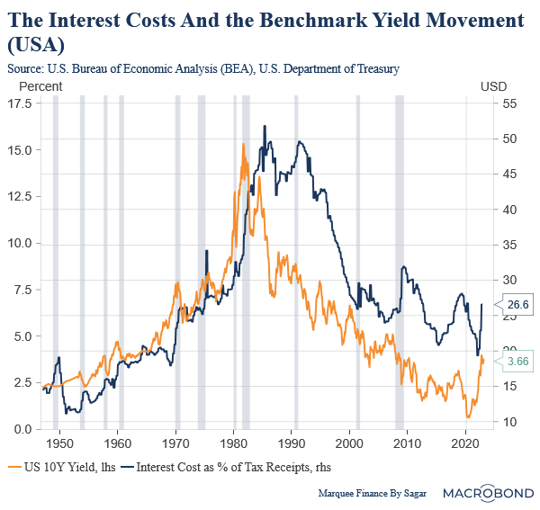 Rising Interest Costs as % of Tax Receipts: If the rates remain in the 3-5% zone for the next 2-3 years, we might see the figure touch as high as 40-50% because it’s different than the 80s now (Debt/GDP is exceptionally high, so the magnitude of the rise will be swift).