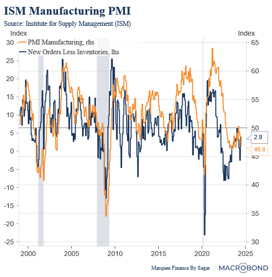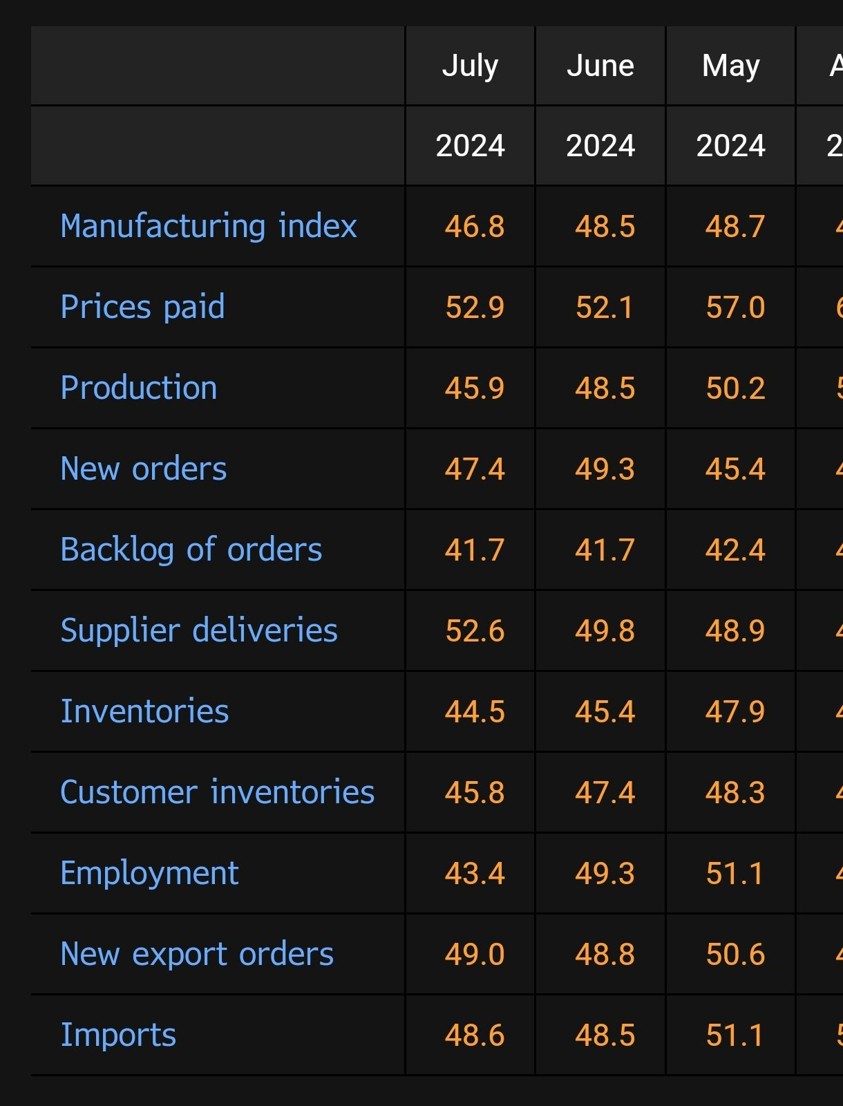 The July ISM print surprised on the downside massively with the headline print at 46.8.