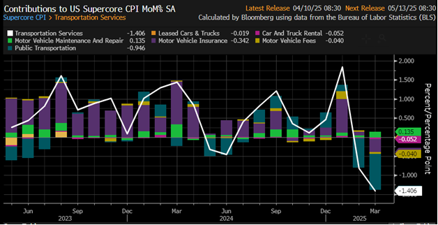 We saw a MoM -0.243% decline in Supercore CPI, led by transportation services (airfares majorly). Furthermore, most components were red except Motor Vehicle Maintenance and Repair.