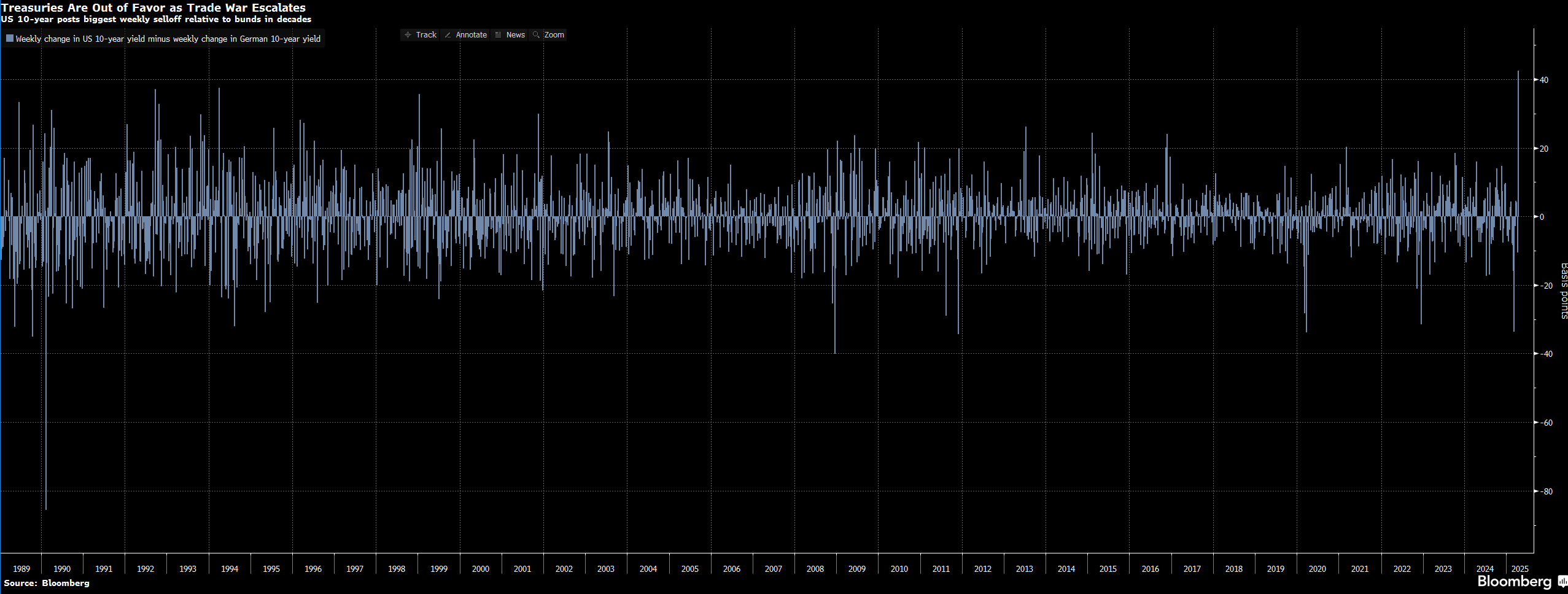 It was the worst week for US Treasuries against the German Bunds. In other words, capital moved from the world’s largest bond market to the European bond markets at the fastest pace on record.