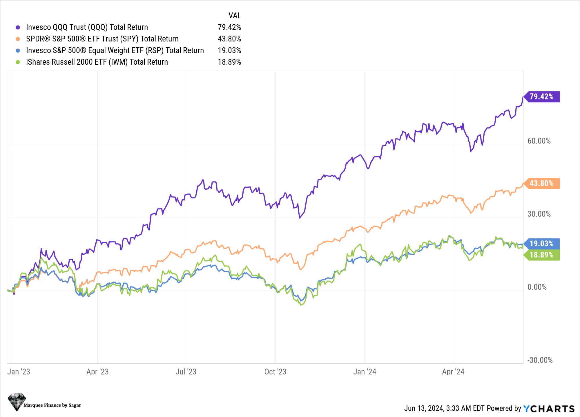 On the contrary, Small Caps (IWM) and the S&P 500 Equal Weight Index (RSP) have given subdued returns, thus indicating that most of the returns can be attributed to the Mag 6/7.