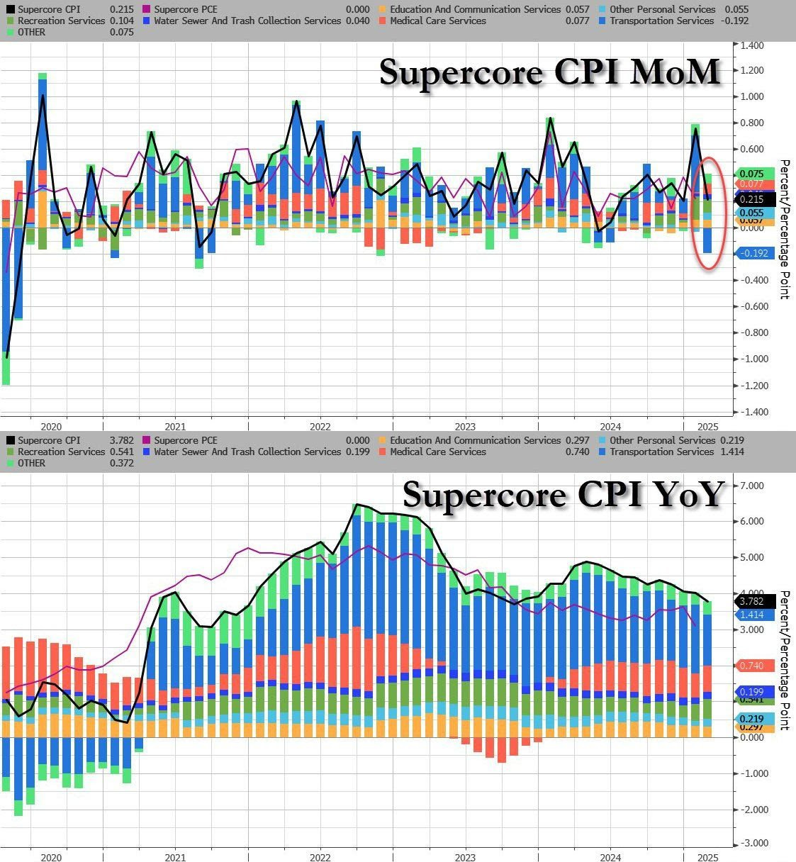 Supercore CPI (Services Ex-housing) was an absolute shocker as it came in at 0.215% against an expected 0.38% (rounding makes it 0.2% vs 0.4%).