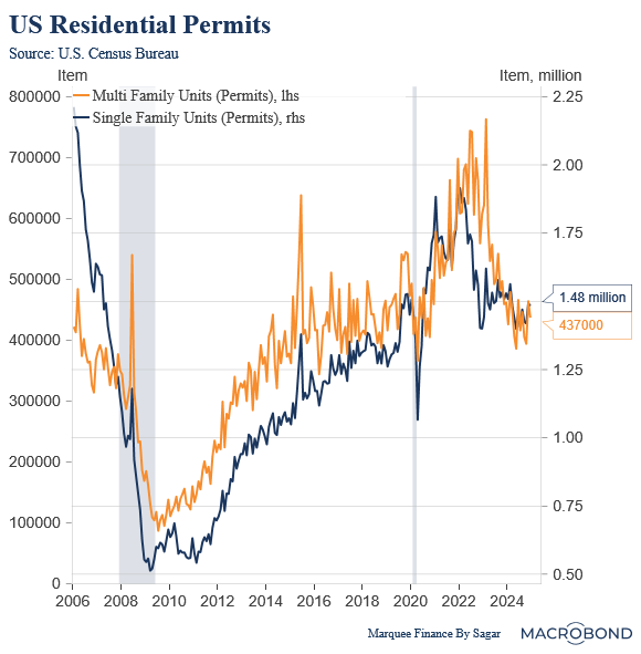 Permits: As we can observe, permits soared massively in 2021/2022. Thus, the projects that applied for permits in the housing bull cycle (multi-housing) in late 2021/early 2022 (before the Fed began the draconian rate hikes) completed in H2 2024 (last year).