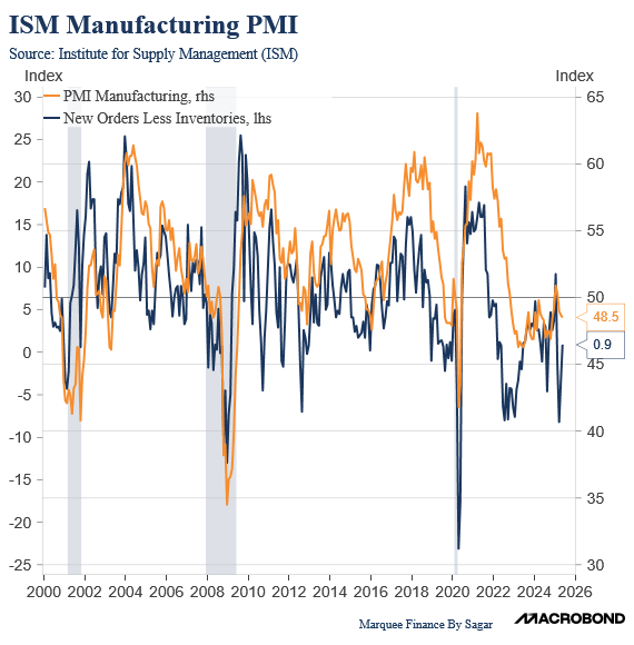 Over the past 2-3 months, the ISM Manufacturing Index, like other soft and hard data, has been noisy due to the front-loading of tariffs. We expect normalisation to transpire in the next month or so.