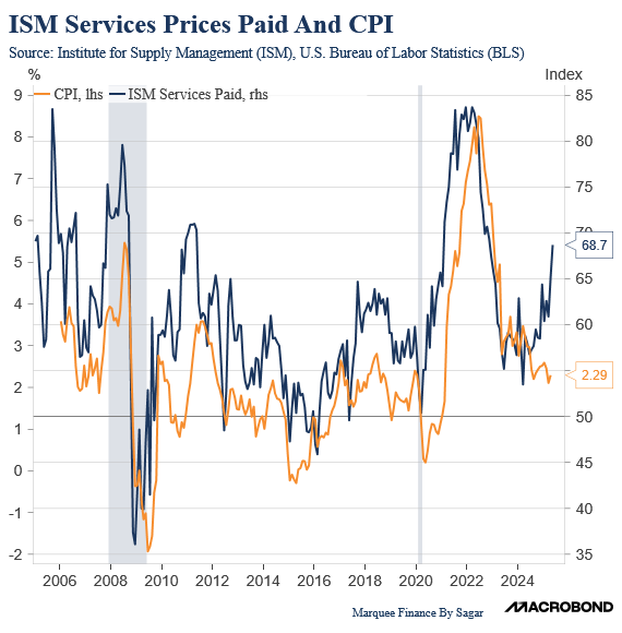 One component of both ISM Manufacturing and ISM Services, which has been sticky (and in fact rising), is the ISM Prices Paid.