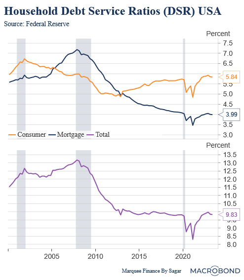 US Household Consumer Debt Service Cost as % of disposable income is at 2008 levels due to skyrocketing APR on personal loans and credit cards. This will be keenly watched as the unemployment rate rises in Q124.