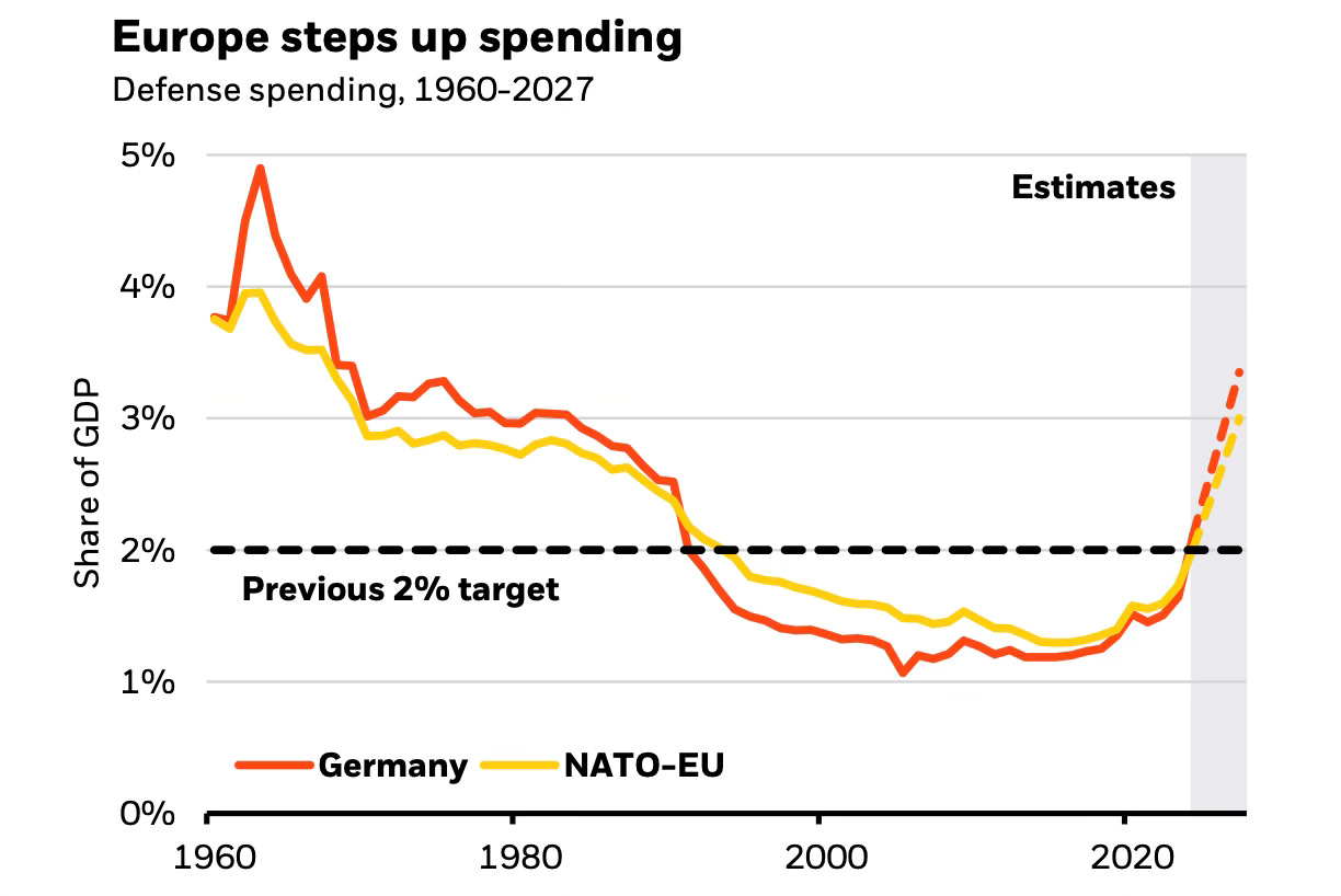 While NATO allies agreed to target defence spending of 5% of GDP by 2035, Germany suspended its “debt brake” to raise defence and infrastructure spending.