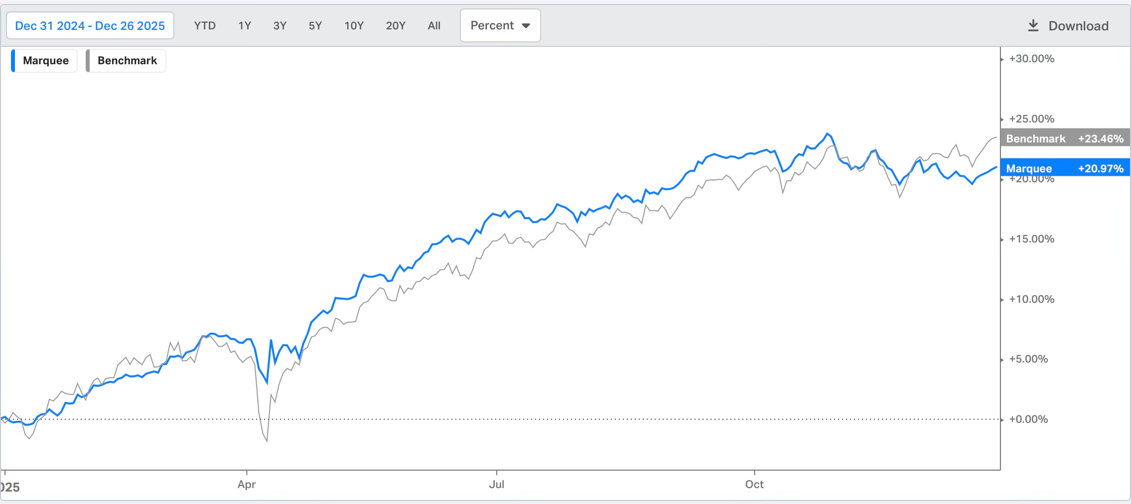 We had a satisfying year, limiting our drawdowns, and we are ending with 21% returns YTD, slightly underperforming the benchmark over the past few weeks after outperforming it for most of the year.