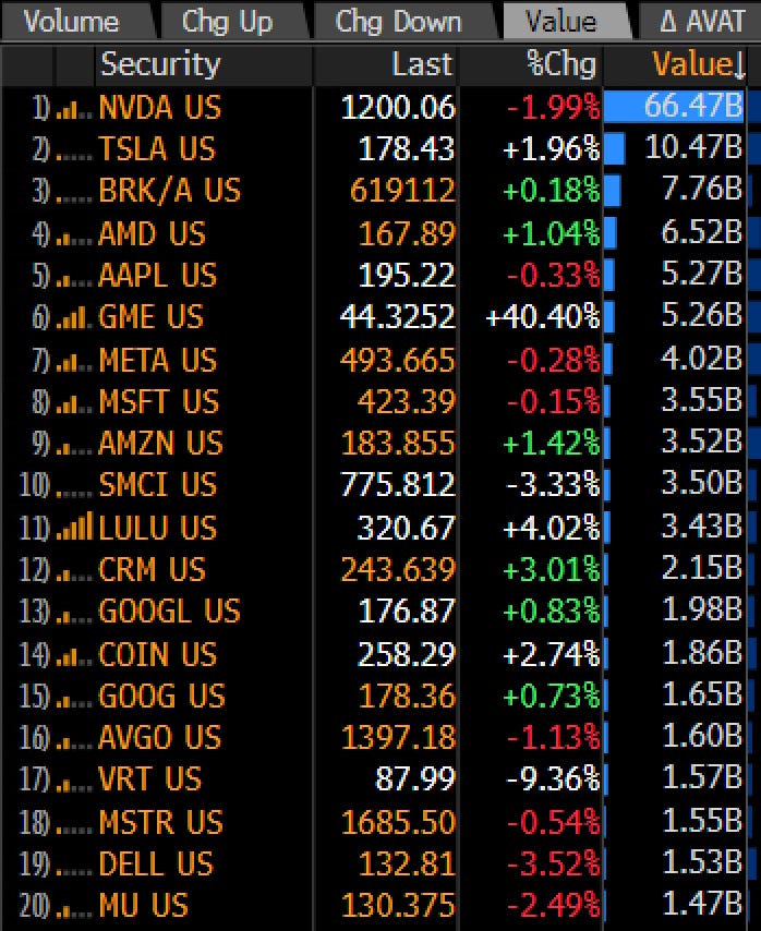 NVDA’s trading volume on Thursday surpassed the volumes of the next 20 actively traded stocks.