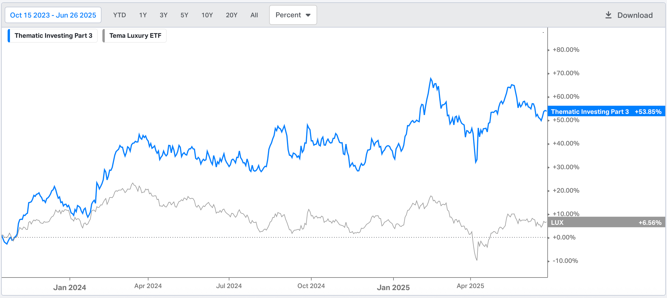 Thematic Investing-Part 3 focused on the luxury theme. We were unable to buy the two stocks we selected due to valuation concerns. Nevertheless, the basket is up 54% since its inception, compared to a return of 6.6% for the benchmark LUX ETF.