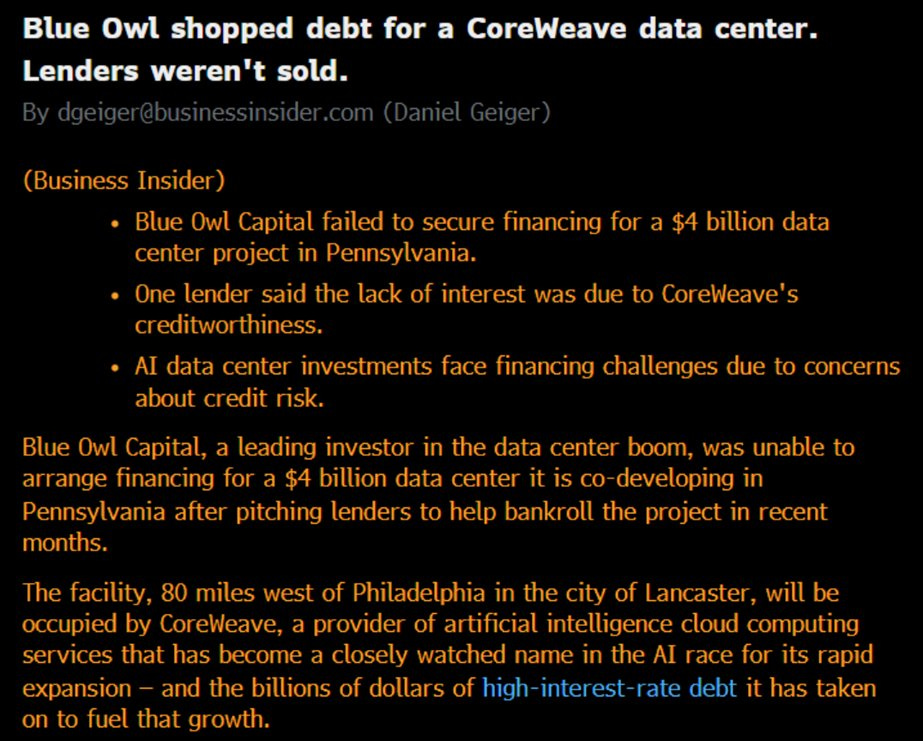 Another quake the market completely ignored was Blue Owl's inability to raise debt for the CoreWeave Data Centre project, indicating that the credit downgrade and the rise in the CDS of companies like CoreWeave and Oracle are derailing the capex plans.