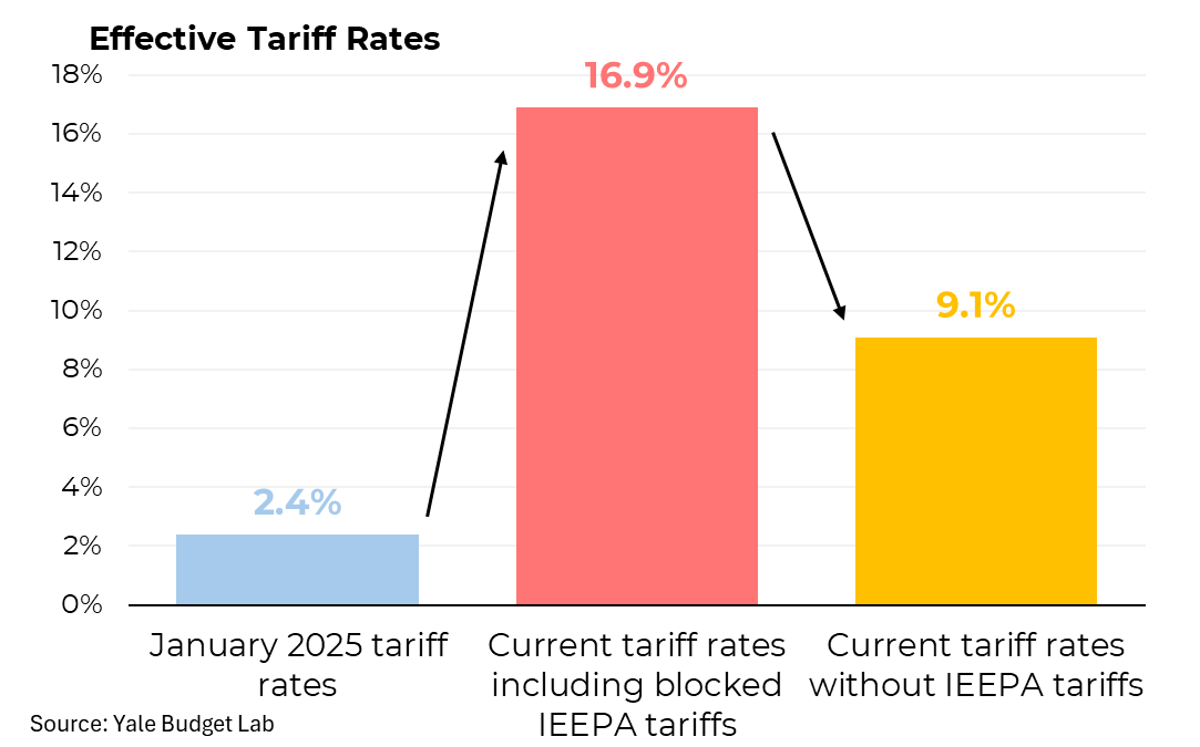 According to the YALE Budget Lab, after the SCOTUS judgment, the effective tariff rate fell from 16.9% to 9.1%.
