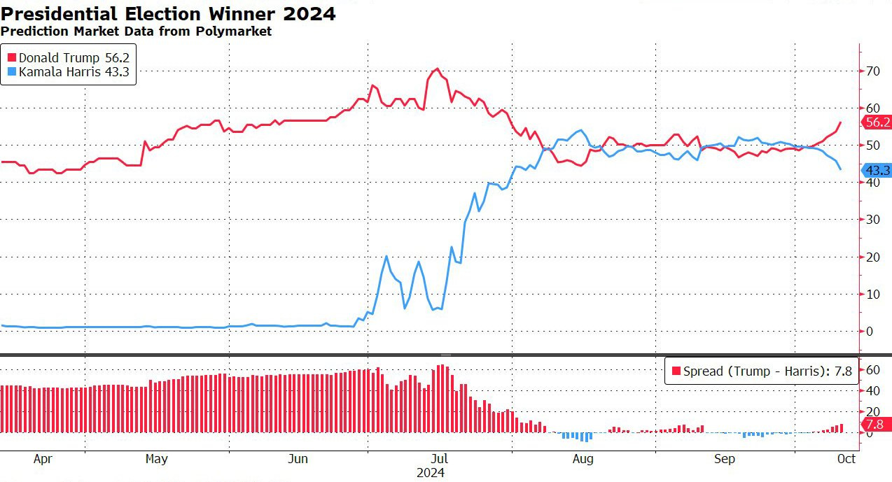The prediction market now favours Trump over Harris by the widest margin in three months.