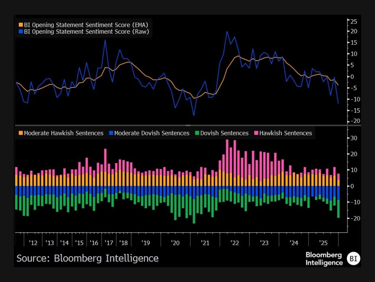Coming to JayPo’s speech, Bloomberg’s natural-language processing model for Fed sentiment showed that Powell’s opening remarks were more dovish than the October meeting and the most dovish since 2021, according to BI’s Jersey. The comments around the asset purchases were a significant driver of this move.