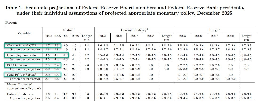 The SEP projects a complete “Goldilocks” scenario, with GDP revised higher to 2.3% for 2026, PCE/core PCE revised lower to 2.4% for 2026, unemployment unchanged, and revised lower to 4.2% for 2027.