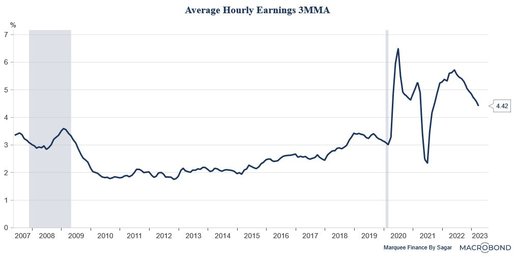 As the economy slows down and layoffs become broad-based, the most lagging indicator of the economy: “The labor market”, will likely cool. Wages are showing signs of a modest fall.