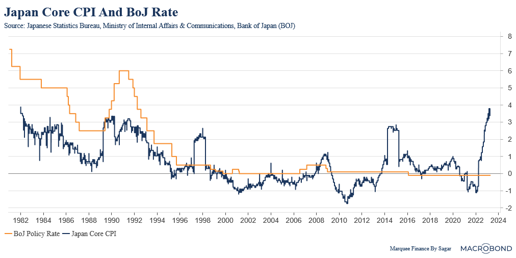 The newly appointed BoJ Governor Ueda gave a long time frame (12-18 months) to normalize the monetary policy even though core inflation continues to hit a fresh 40 year high.