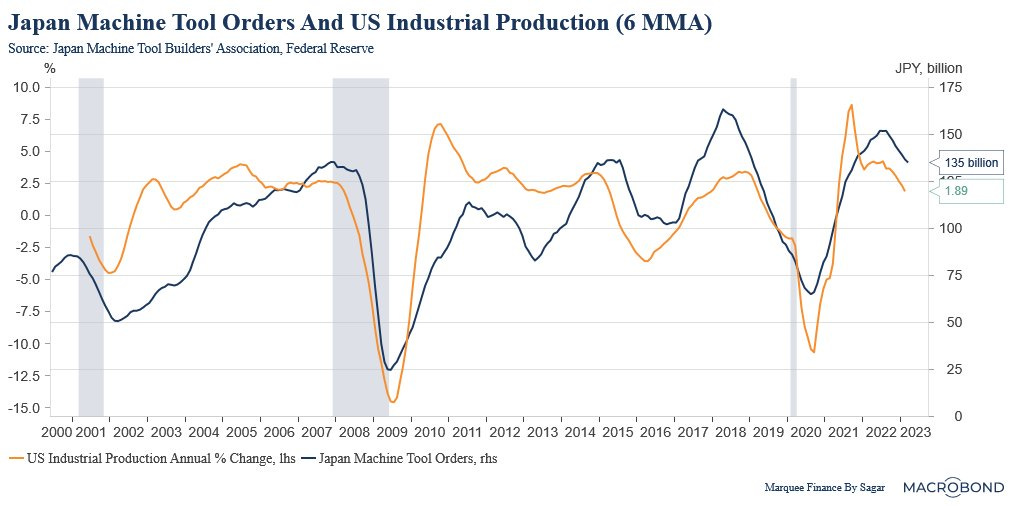 When we dig deep, the US cyclical sectors are witnessing a broad-based slowdown. Japanese Machine Tool Orders has an incredible record of predicting the cyclical peak and trough of the business cycles in the US.