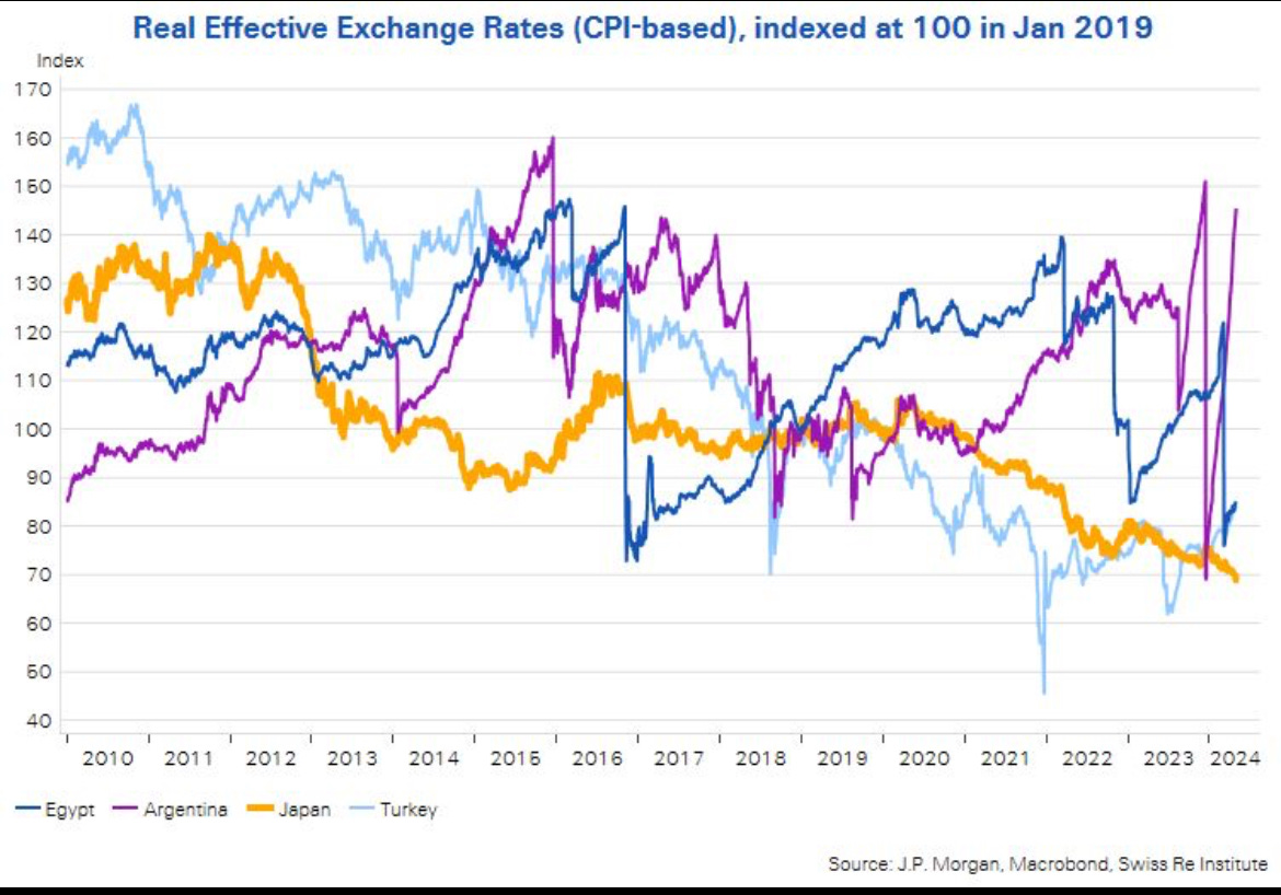 The real effective exchange rates paint a grim picture, with JPY being the worst performer. Surprisingly, the Egyptian Pound, Turkish Lira and Argentina Peso outperformed the JPY.