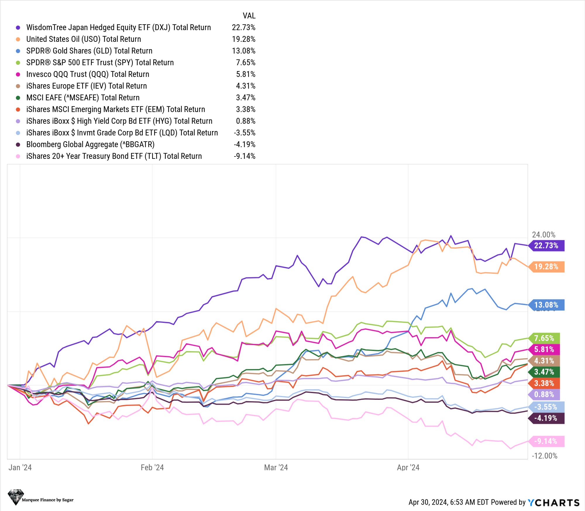 April saw a cool-off in the risk assets as the world’s largest central banker pivoted and turned into a hawk after the resilient economic data and higher-than-expected inflation readings led Mr Market to reduce the number of cuts from 7 at the beginning of the year to just 1/1.5 cuts today.