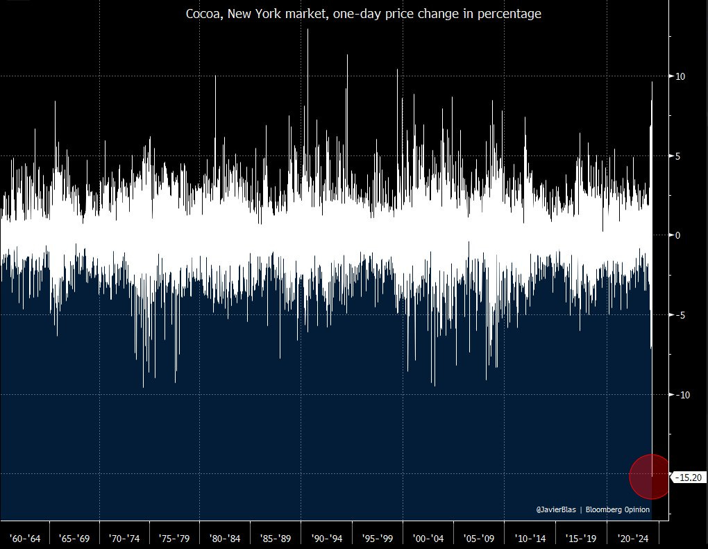 Well, folks, yesterday, Cocoa witnessed its biggest fall in history, with prices crashing by 15% in 24 hours (think liquidity).