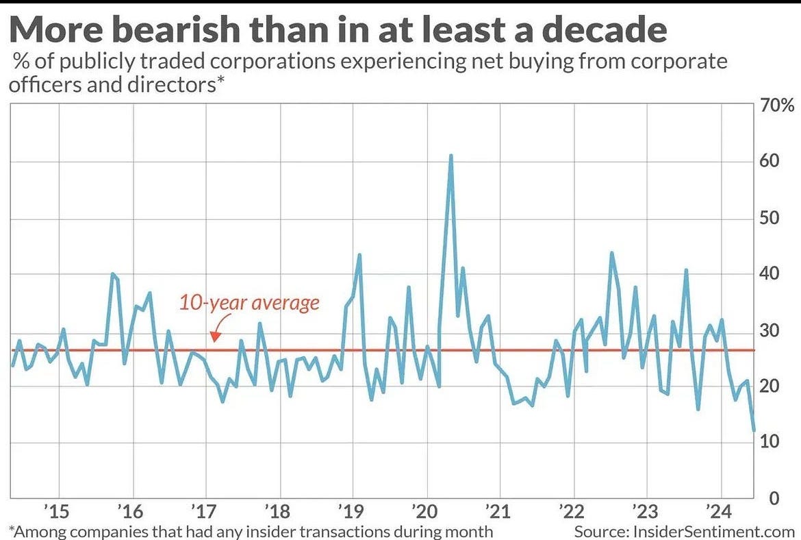 Just 10% of insiders (corporate officers and directors) were optimistic and buying their stocks, indicating extreme bearishness.