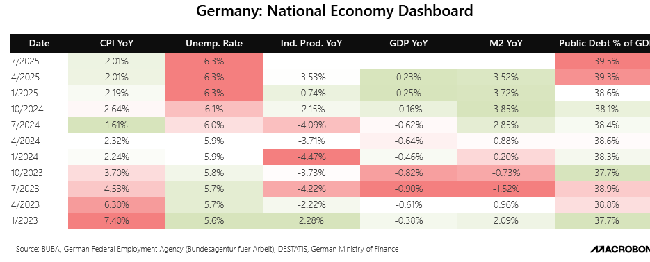 Germany has been unable to recover from the 2022 energy crisis that paralysed its industrial base. While the CPI has moved down considerably to the 2% target, industrial production has failed to recover, and the unemployment rate has jumped sharply over the last 24 months.