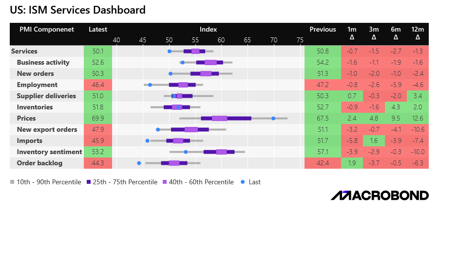 The ISM Services Dashboard indicates that while the prices component has skyrocketed to 70 (one of the highest readings in recent years) and has remained persistently high, the Employment component has been below 50 (and is falling), indicating contraction.
