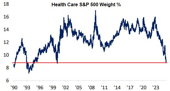 Once favourites among conservative investors and those who love defensive stocks, the healthcare sector's weight as a percentage of the S&P 500 has dropped to multi-decadal lows.