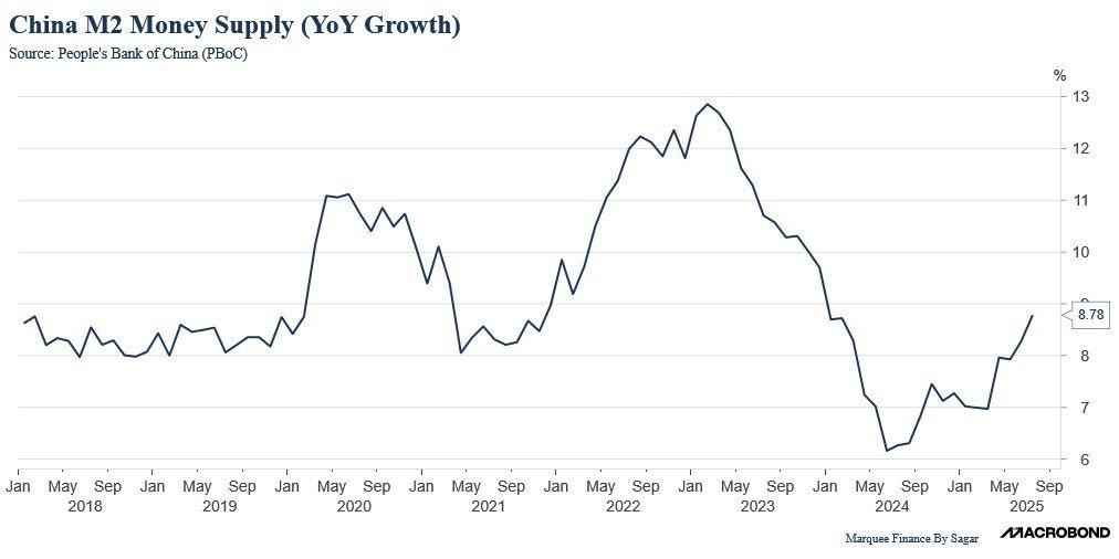 After 4 years, the Chinese Money Supply, as measured by M2 growth YoY, is in a strong uptrend, a change that's transpiring after a long time.