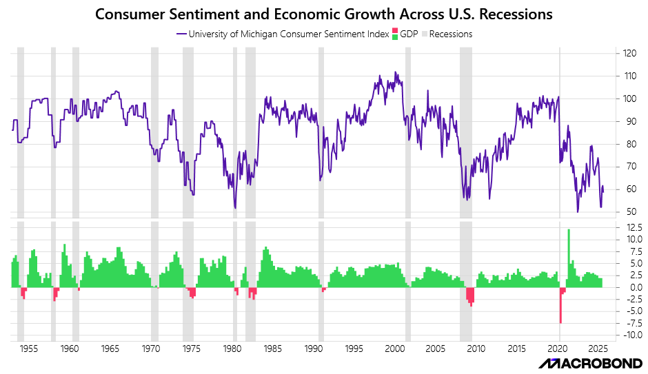 When the April equity crash occurred, consumer sentiment dropped to levels last seen during the 2022 bear market. However, it has since rebounded but remains in the danger zone.