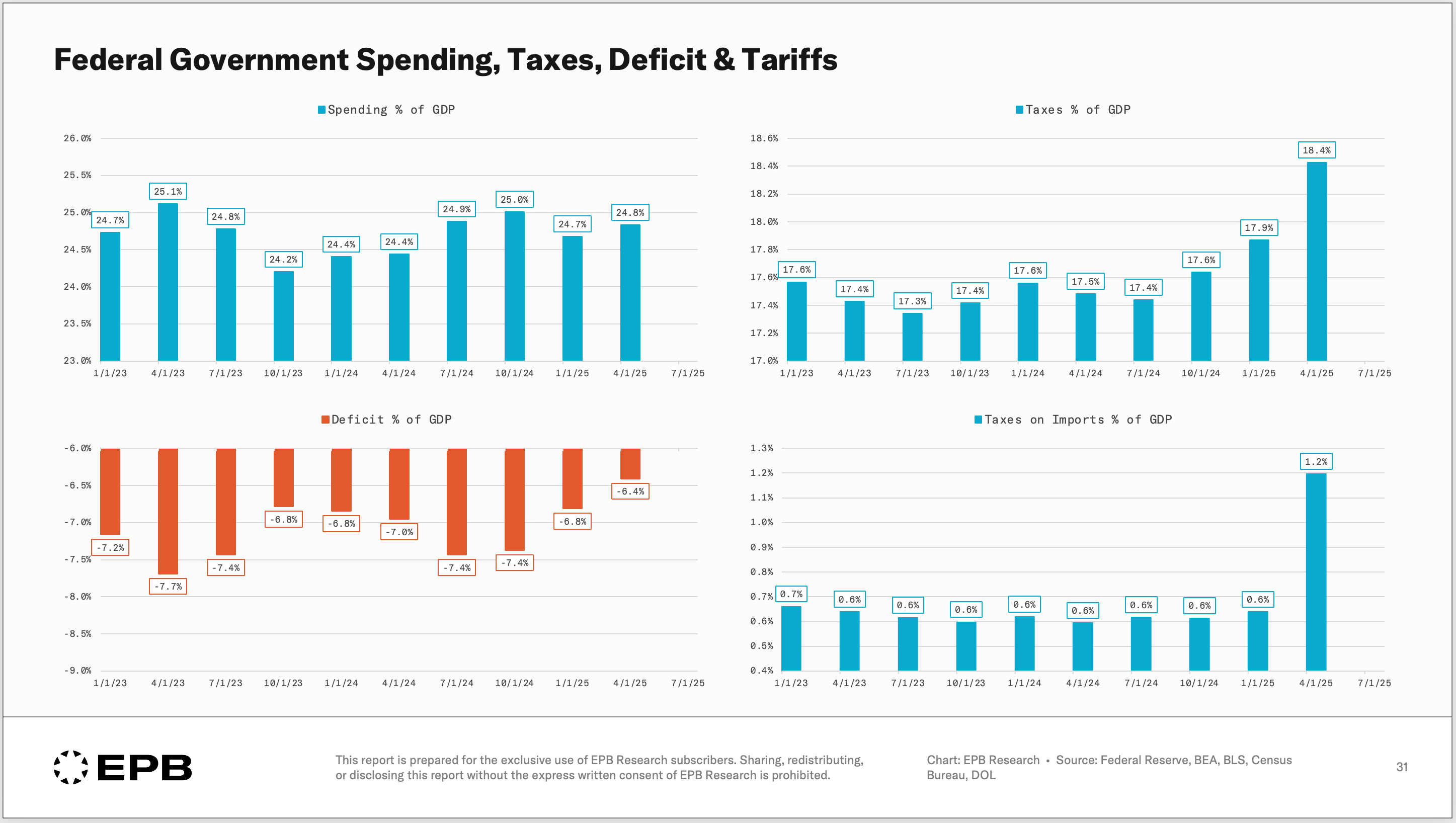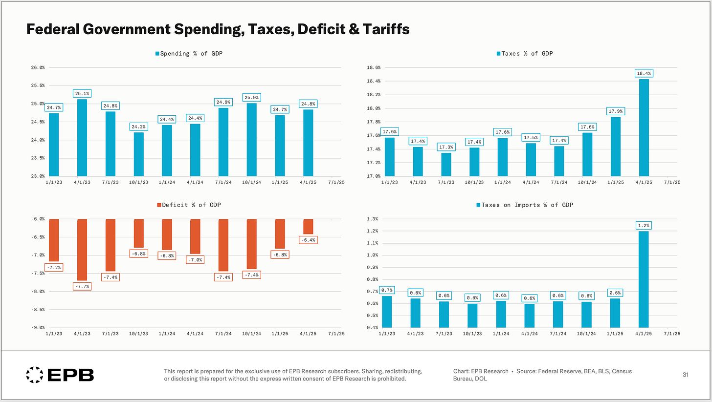 Although the spending pattern has remained unchanged, the deficit has decreased in recent quarters as tariff revenues began to materialise. As a result, the tax rate as a % of GDP has increased to more than 18%.