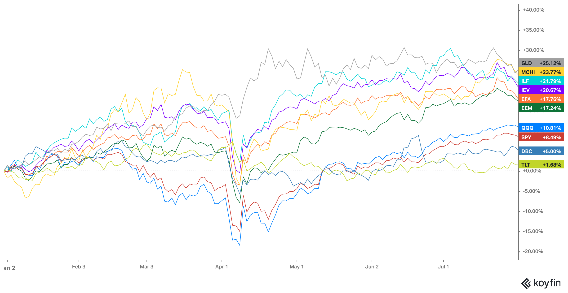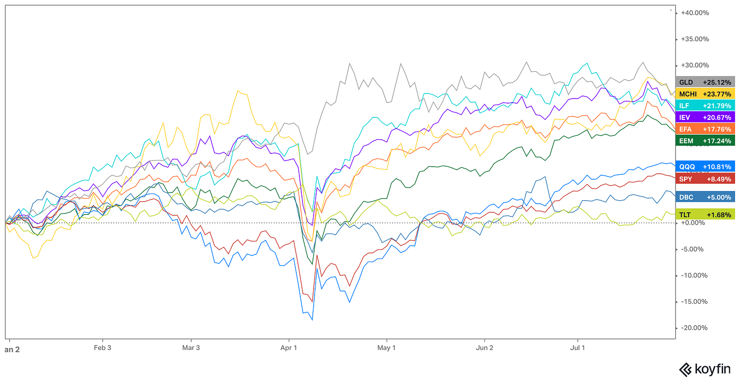 Due to various headwinds, long-term bonds remain the biggest underperformers, with the flagship TLT up only 2% (total return). Commodities (ex-PMs) have also lagged as oil has been in a bear market.