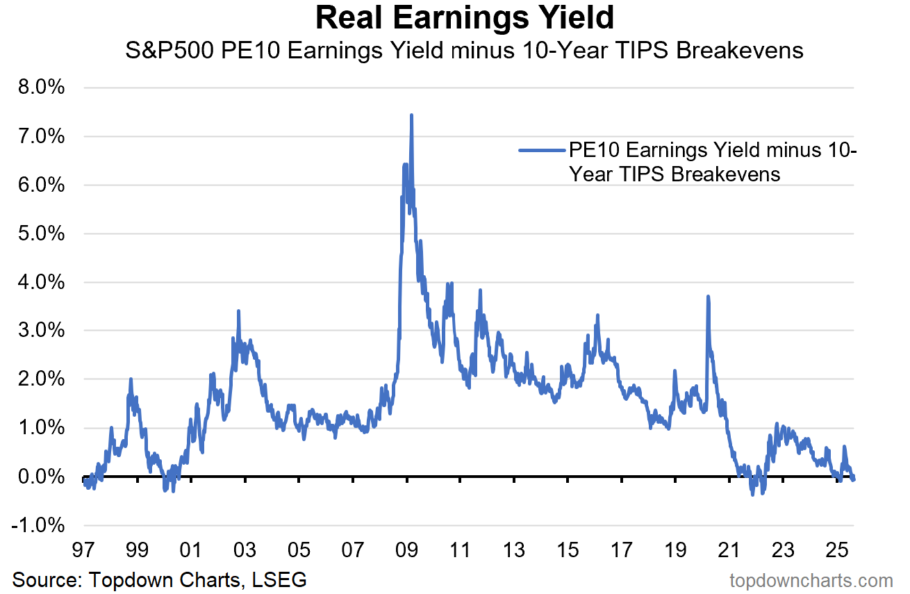 When we look at the Real Earnings Yield (calculated at S&P500 Earnings Yield - 10Y TIPS), we are nearly reaching the extremes that we witnessed in the euphoric 2021 heights.