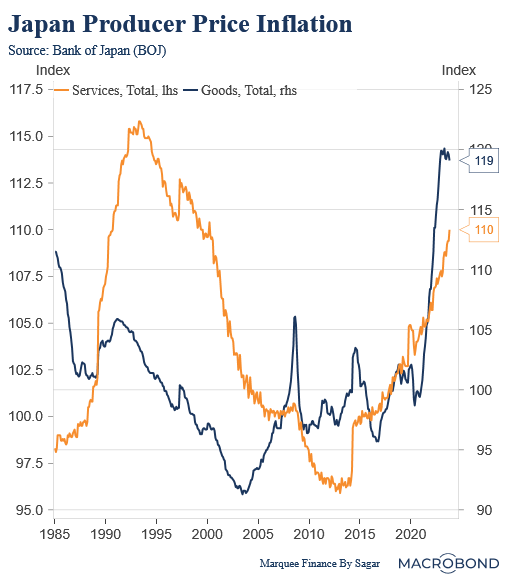 On the other hand, the land of the rising sun is moving out of the three-decade-old deflationary trap as services inflation skyrockets. The Services PPI is now at the levels last seen at the beginning of the 21st century.