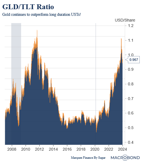The GLT/TLT ratio reached its 2012 peak as Gold massively outperformed the ultra-long bonds.