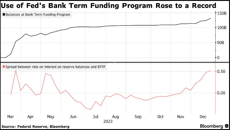 December saw a funny phenomenon where banks in the US entered into an arbitrage trade with record volumes. Taking the benefit of the record spread between reserve balance and BTFP, banks borrowed heavily from the BTFP facility and parked money at the Fed, earning risk-free profits!!