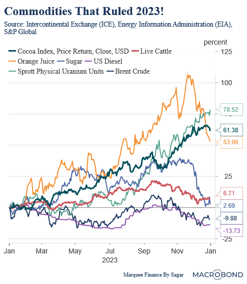 While the broader commodities had a terrible year, the stars of 2023 were Uranium, Cocoa and Orange Juice.