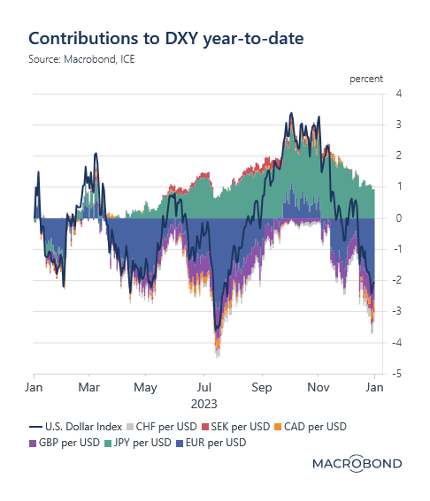 Coming to planet FX, the Dollar gave a negative return in 2023. While GBP and EUR gained due to the hawkishness of the ECB and the BoE, JPY’s weakness was the biggest contributor to the DXY's strength as BoJ maintained its ultra-accommodative stance of the Negative Interest Rate Policy (NIRP).