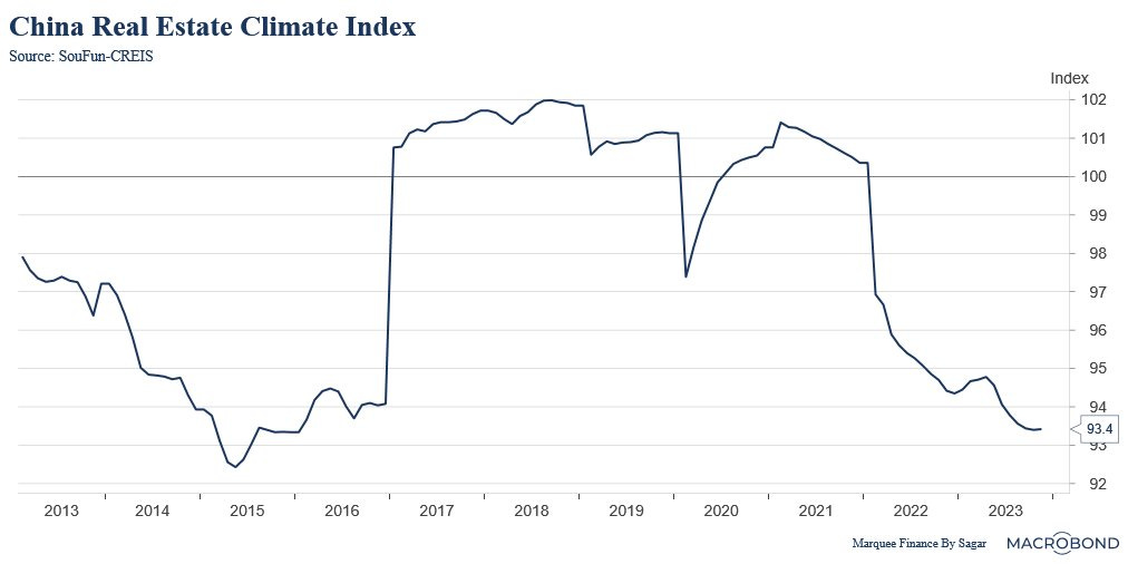 China’s property meltdown was again at the forefront in 2023, with the second-largest developer, Country Garden, going under. The fear of a balance sheet recession is rife as property prices have plunged by double digits in the last two years despite Chinese consumers hoarding trillions of yuan of excess savings.