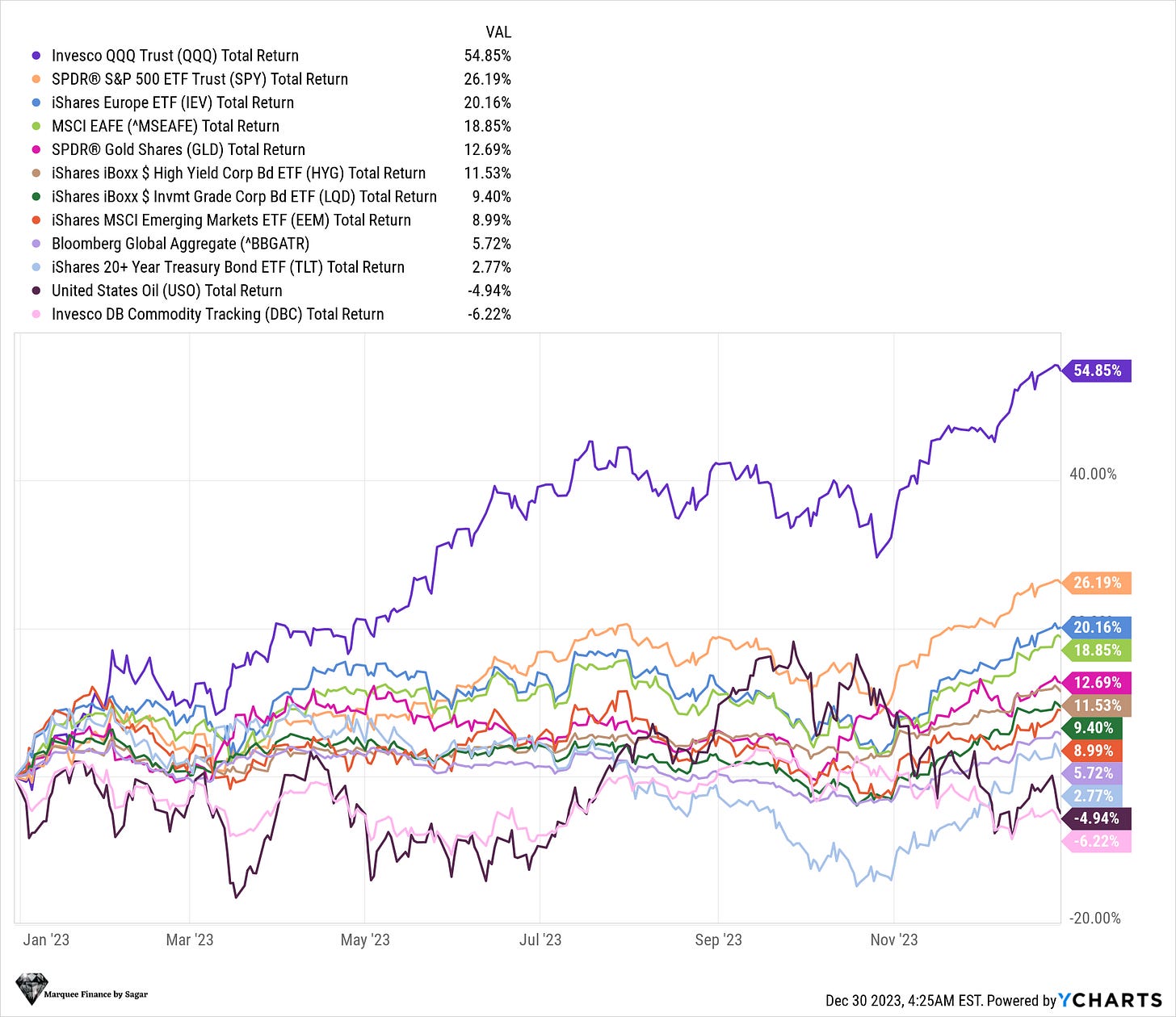 2023 saw fireworks across risk assets with the consensus call of a “recession” gone horribly wrong. As a result, the tech-heavy QQQ returned a spectacular 55%.
