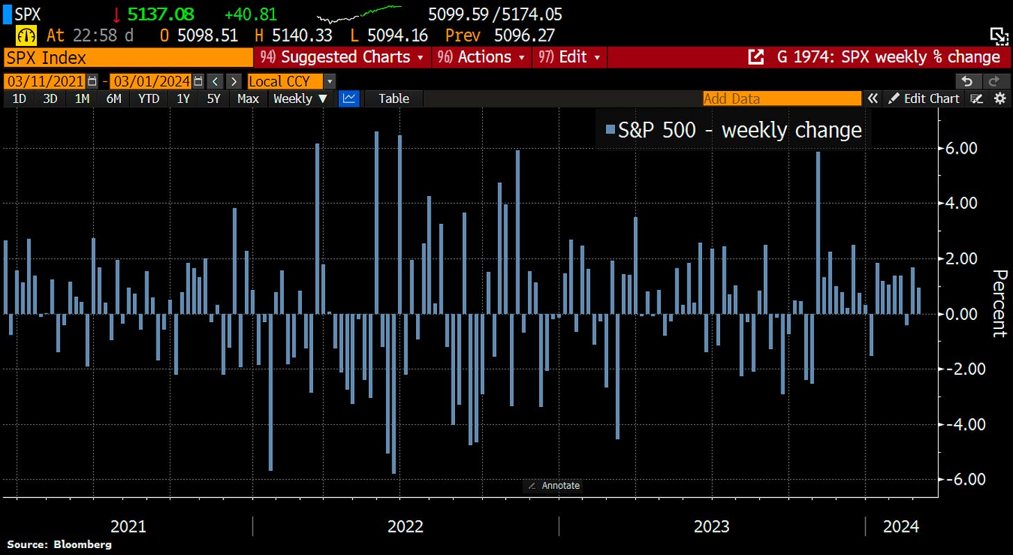 Notably, the S&P 500 has now advanced for 16 of the last 18 weeks. The last time that happened was in 1971, shortly before the end of the Bretton Woods system. The S&P 500 has now rallied 24% from its October lows.