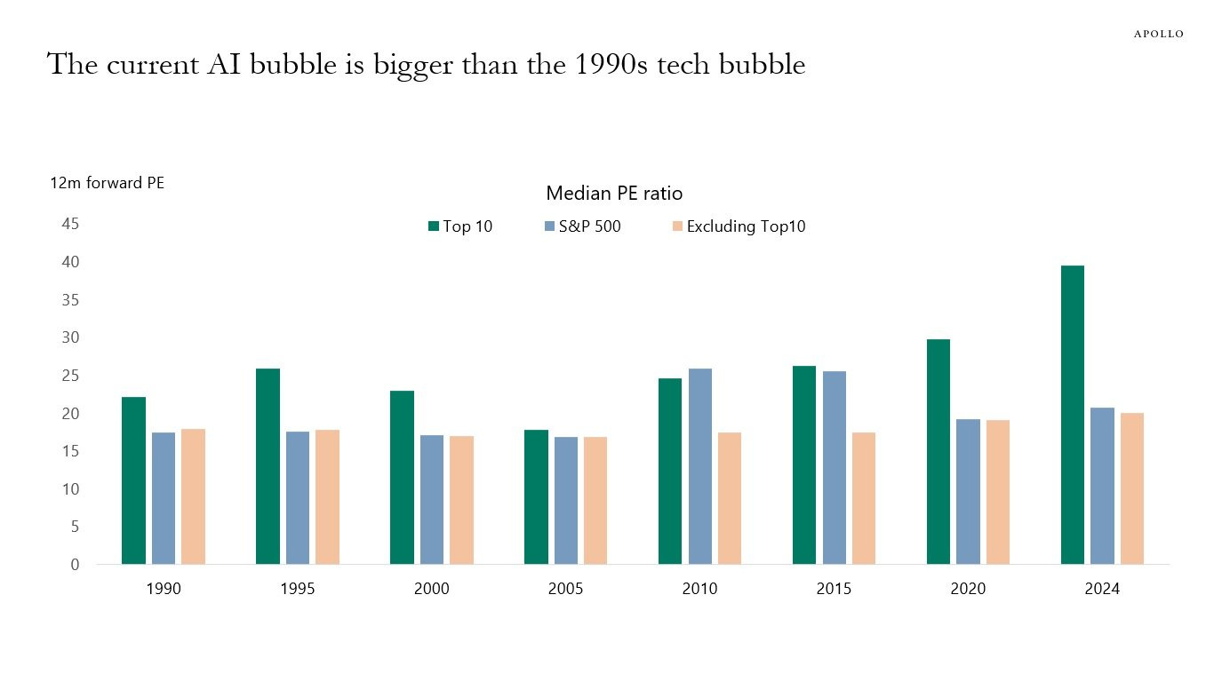 “Forward P/E ratio for the top 10 tech stocks right now is ~40x. Compared to 2000, at the peak of the Dot-com bubble, the Forward P/E on the top 10 tech stocks was ~26x.”