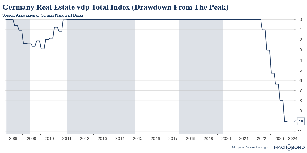 In stark contrast to the US, where housing prices have touched all-time highs despite 30-year high mortgage rates, Germany’s real estate prices are now in the midst of the worst drawdown ever.
