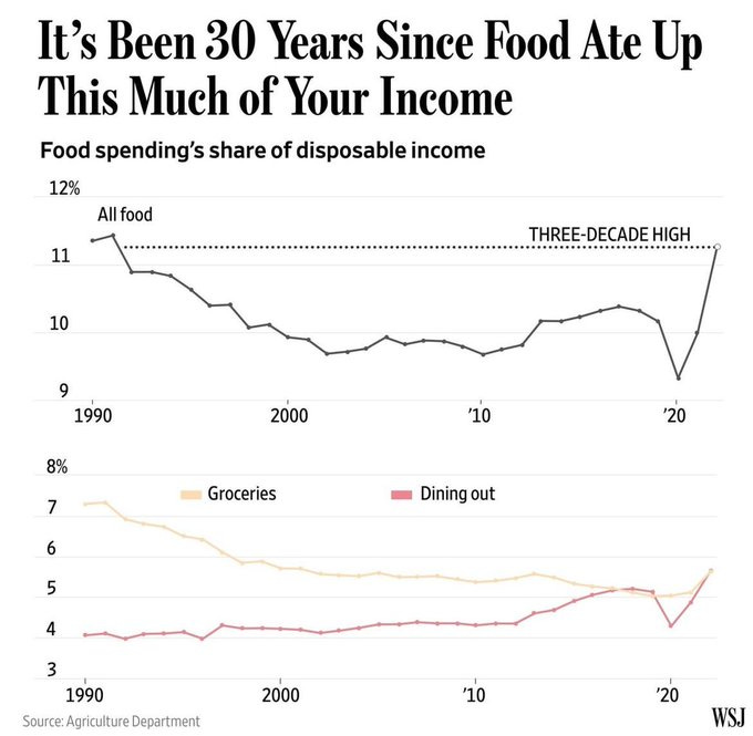 Nonetheless, the absolute price increases have been so enormous that food spending as % of disposable income has reached a three-decade high!