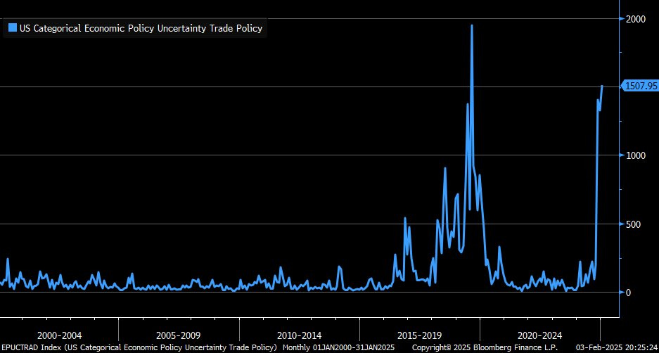 The Economic Policy Uncertainty (Trade Policy) Index is now up to the levels last seen during the peak of the US-China Trade war in the last Trump administration.