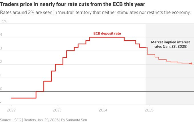 Traders are pricing in four more ECB cuts this year, which is supporting European stocks in their ride-up.